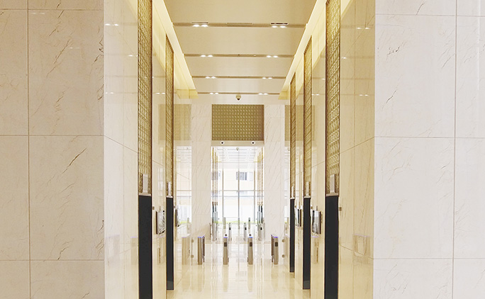 3、12m挑高大堂的氣勢于第一眼征服感官;配備16部日本原裝進口三菱電梯,2.8米超高轎廂,最高梯速達到5m/s,擁有靜音、穩定、舒适等優勢,并采用智能化電梯預分配系統,分高中低三區運營,全面縮短等候時間。